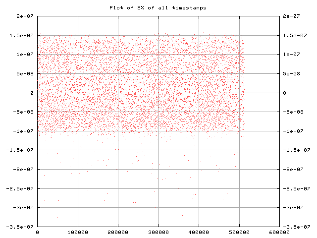 This first plot shows 2% of the total 512519 timestamps in this dataset. Apart from a low frequency of outliers, the data seems to fit nicely with our expected plus/minus 120nsec.