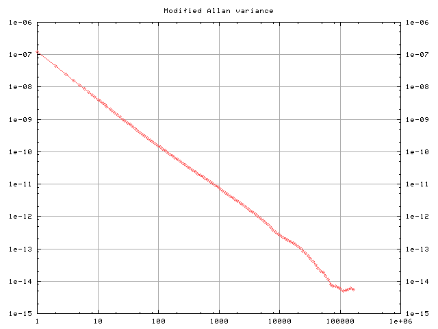 In order to determine if there are any systematic or periodic phenomena, we need to statistically analyze the timestamps. This plot shows the modified allan variance. While this is not exactly the kind of analysis it is designed for, it does show a convincingly straight line which is indicative of nothing but random jitter impacting the signal.